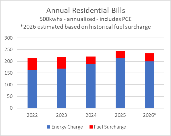 - Fuel Cost Adjustment. The fuel cost adjustment is a separate charge that collects for the fuel used in the diesel generators. Since CEC uses more diesel fuel in the winter when less water is flowing at the hydroelectric facilities, the fuel cost adjustment is higher in the winter and lower in the summer. This rate is calculated on a quarterly basis. CEC doesn’t make a profit on the fuel cost adjustment; it is a full pass through to the customer. Any amounts over or under collected are rolled into the next quarter’s rate. The graph below shows the average residential bill broken out into energy charges and fuel surcharges.